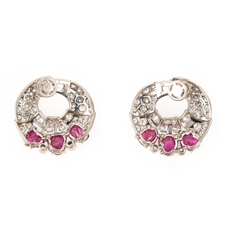GEORGES LEDERMAN, A PAIR OF ART DECO RUBY AND DIAMOND EARCLIPS, 1920s, designed in the 'Tutti Frutti' style, each of scroll design set with three carved rubies to a pierced surround of old circular-cut diamonds and baguette-shaped diamond accents in platinum, French control mark and maker's mark, screw fittings, width 2.2cm