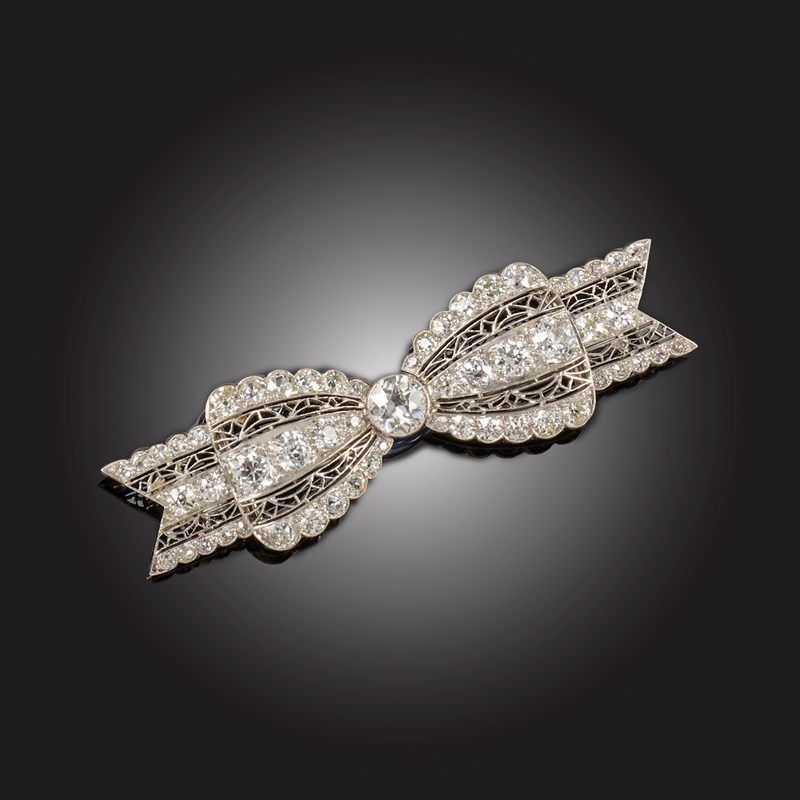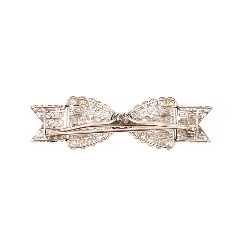 AN EARLY 20TH CENTURY DIAMOND BROOCH, of bow design, with millegrain-set graduated old circular-cut diamonds and bands of filgree decoration, mounted in platinum to a gold pin, width 6cm
