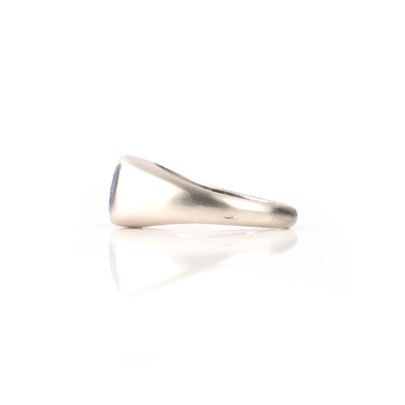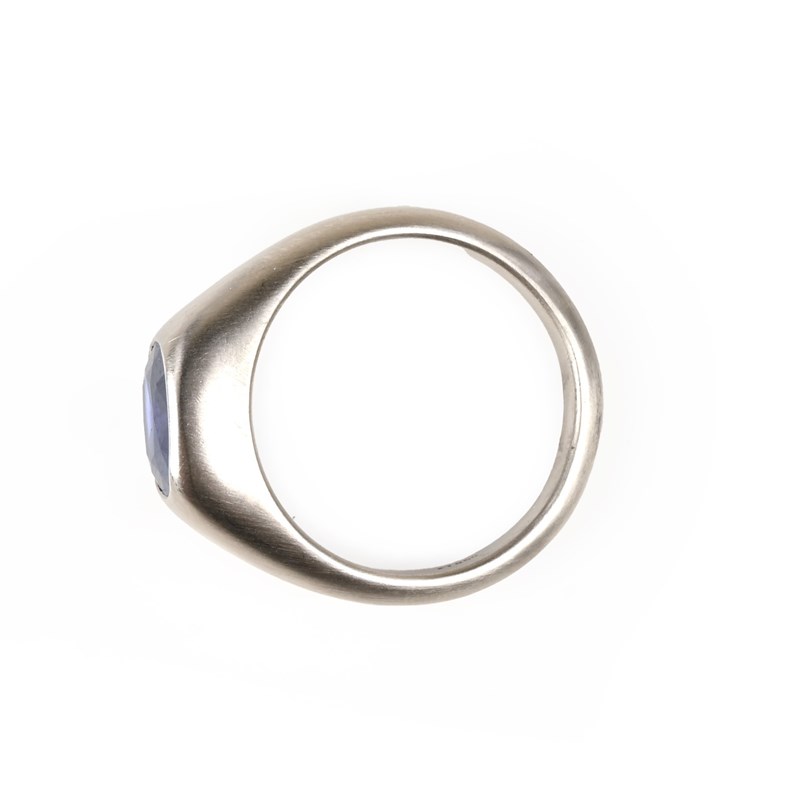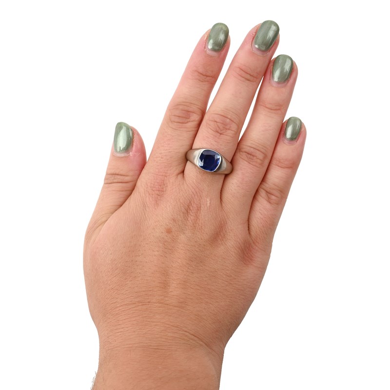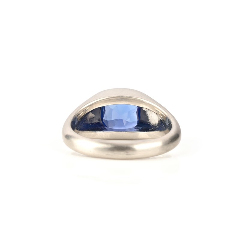 A SAPPHIRE SOLITAIRE RING, the cushion-shaped sapphire weighing 3.26cts, in plain rubover setting in brushed platinum, size S