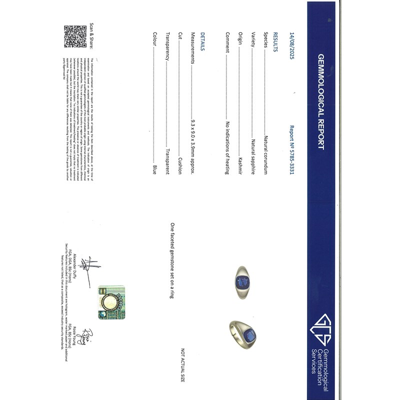 Accompanied by GCS report number 5785-3331 dated 15th August 2025 stating that the cushion-shaped sapphire shows no indications of heating, origin: Kashmir