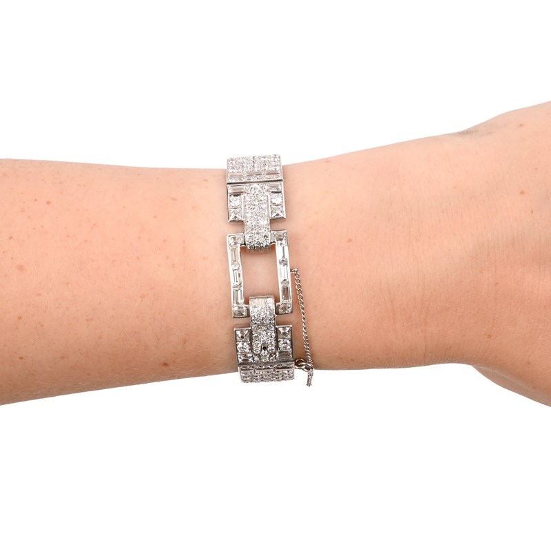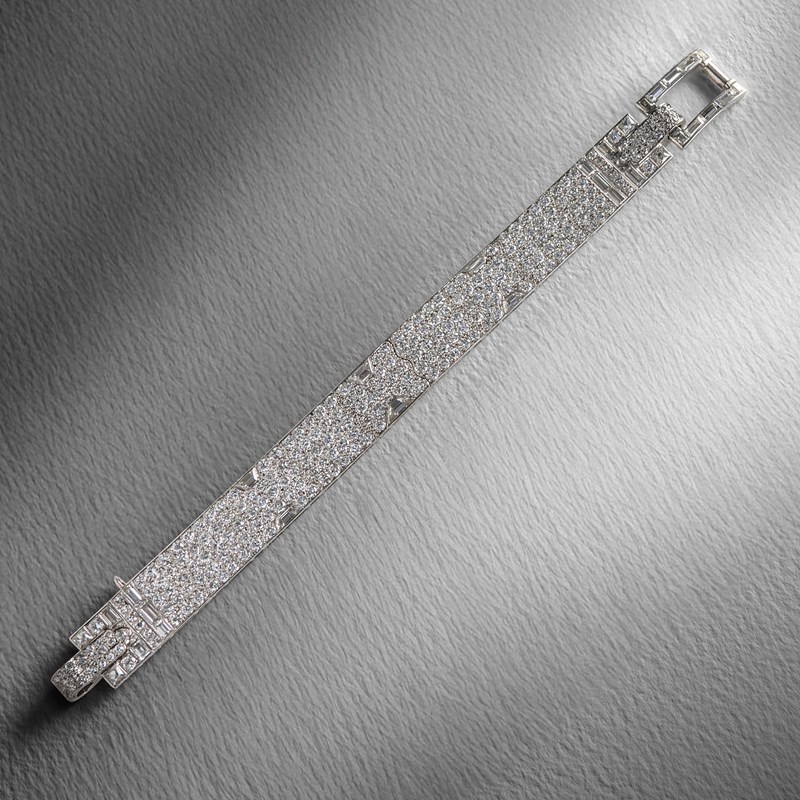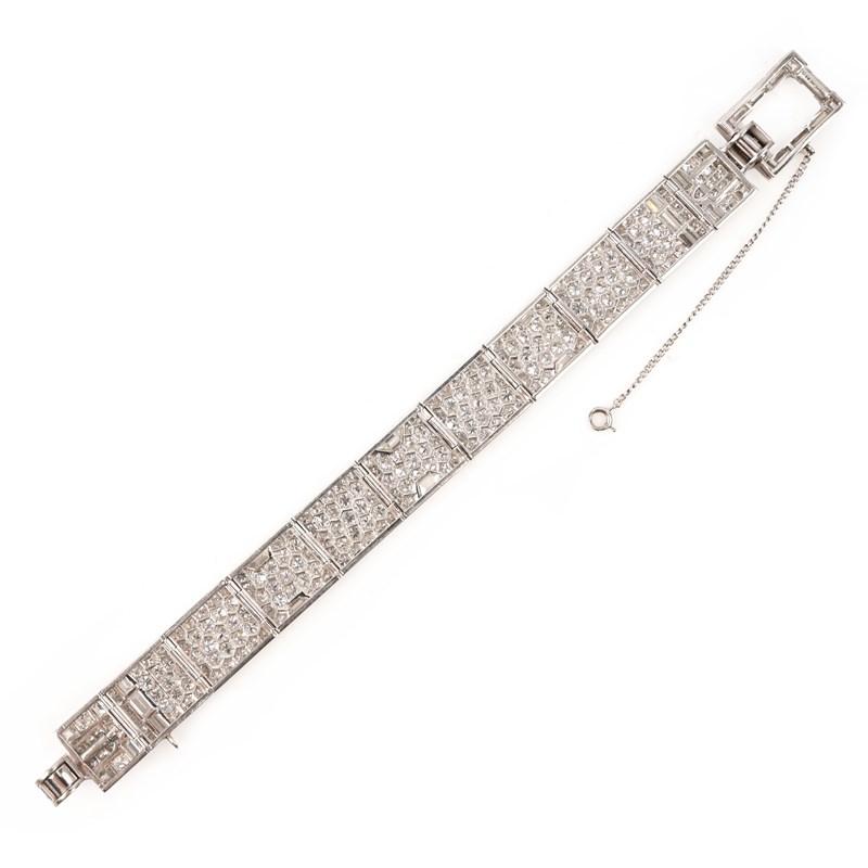 AN ART DECO DIAMOND JARRETIERE BRACELET, 1920s, composed of rectangular panels pavé-set with circular-cut diamonds with undulating edges, alternately-set with panels set with trapeziod-shaped diamonds, the clasp of buckle design set with baguette-shaped diamonds in platinum, numbered 20008, length 18cm