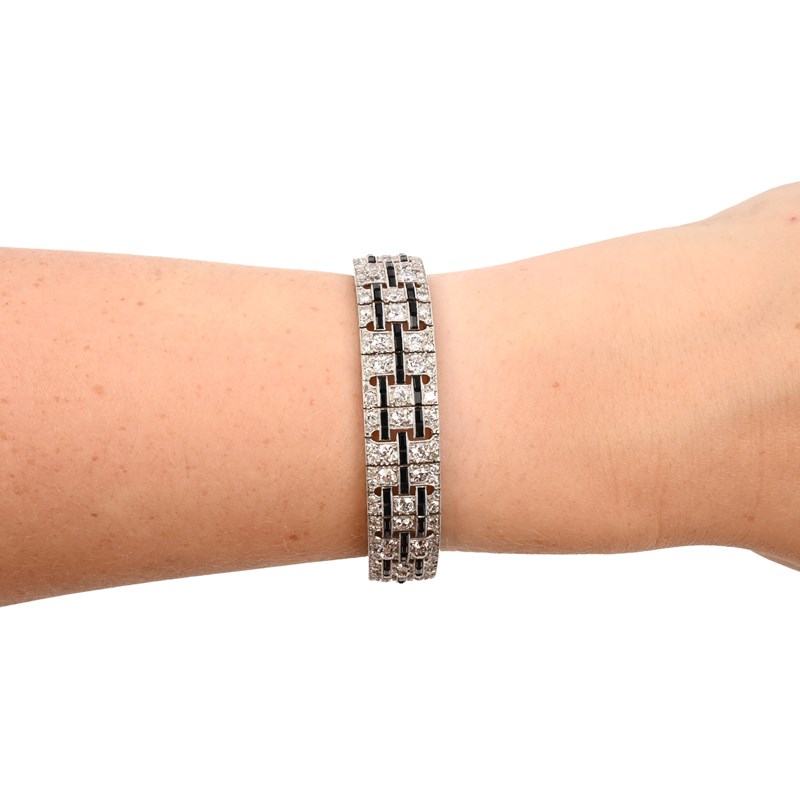 LOUIS MARUZZI, AN ART DECO DIAMOND AND ONYX BRACELET, CIRCA 1925, composed of pierced links pavé-set with old circular-cut and single-cut diamonds with baguette-shaped onyx in milligrain settings, forming a trompe-l'oeil woven pattern, in platinum, French control marks and maker's mark, length 17.5cm