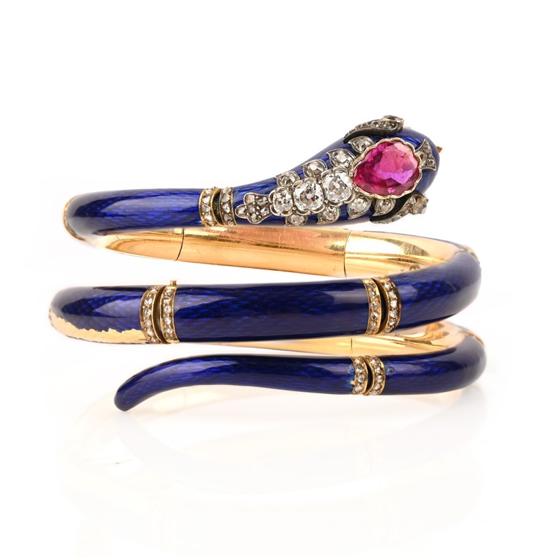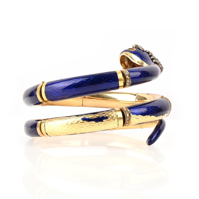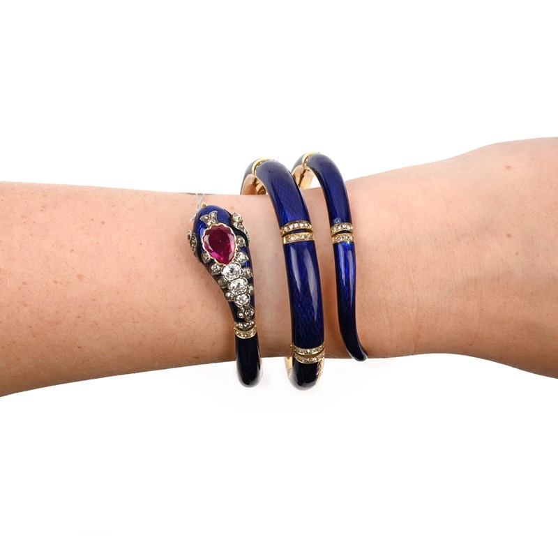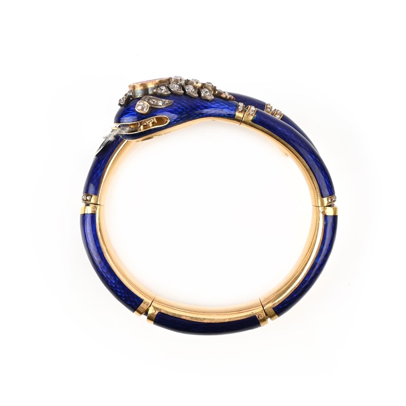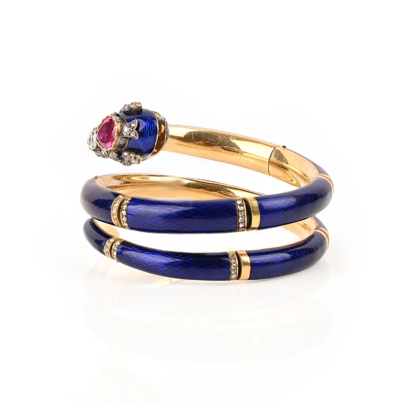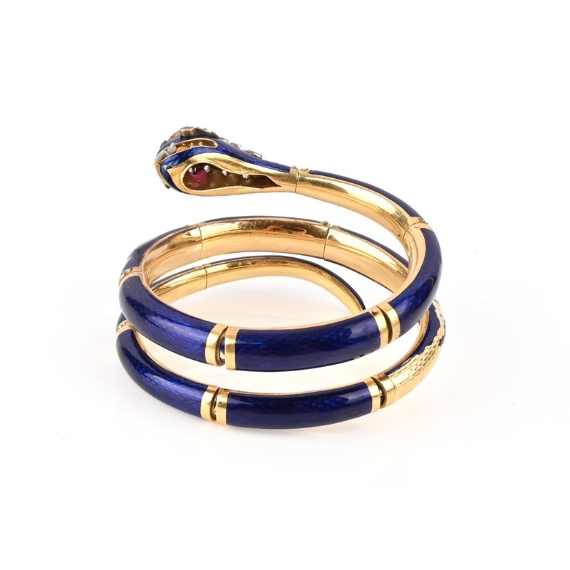 A VICTORIAN RUBY, DIAMOND AND ENAMEL BANGLE, CIRCA 1860, designed as a coiled snake, its head set with a pear-shaped ruby and cushion-shaped and rose-cut diamond, the articulated links decorated throughout with blue basse-taille enamel and diamond-set borders, in yellow gold, inner circumference approx. 17.5cm, gross weight 75g, enamel damaged