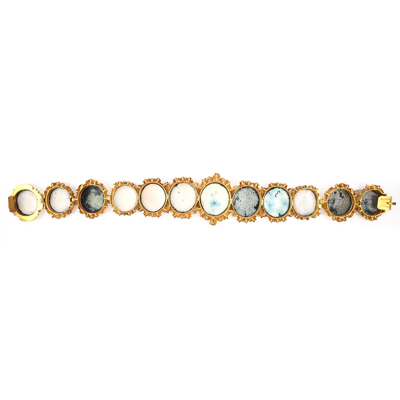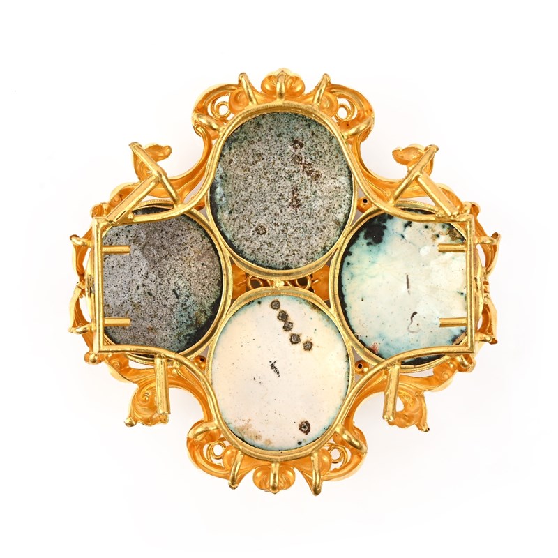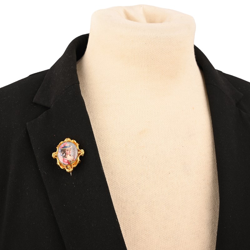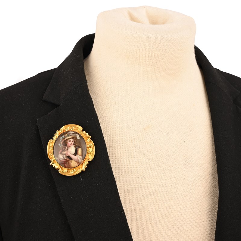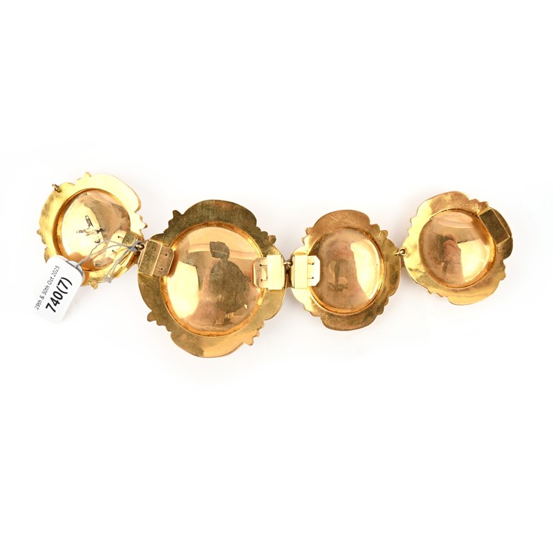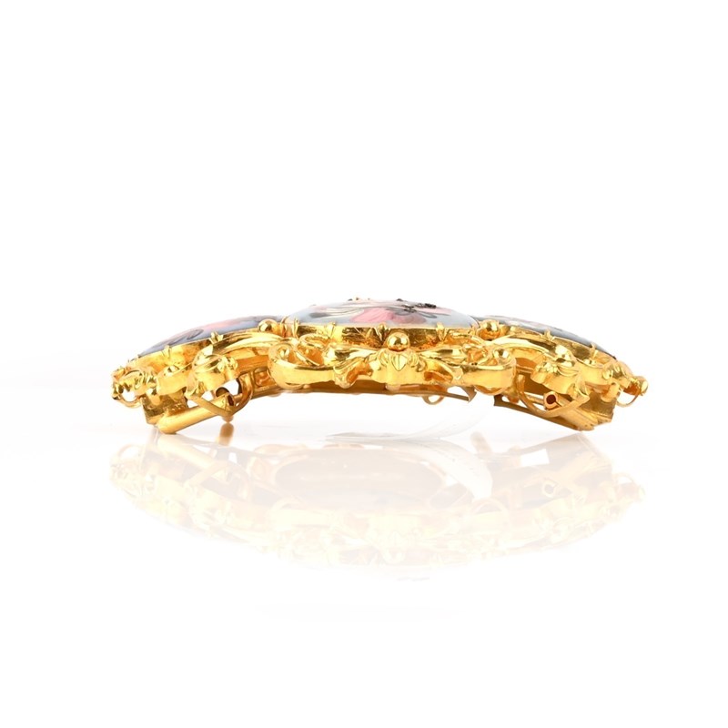 A 19TH CENTURY PORTRAIT MINIATURE AND GOLD DEMI-PARURE, comprising: a choker necklace, each link set with an enamel portrait miniature of a lady in 18th century dress, one accented with rose-cut colourless paste, all within elaborate repoussé gold surrounds, length 32.5cm, gross weight 63g, one miniature chipped; a large clasp, set with four enamel miniatures of ladies set with rose-cut paste, in a similar gold surround, width 6.5cm, gross weight 27g; a brooch, set with an enamel miniature of a lady and her dog, within a gold surround, length 4.5cm, gross weight 13g; a smaller brooch, set with an enamel miniature of a lady, in a gold surround, length 3cm, gross weight 4g; a pair of pendant earrings, each set with two enamel miniatures of ladies, in gold surrounds, drops detachable, length 6.8cm, gross weight 18g; and four links, each set with a miniature of a lady, in gold surrounds, overall length 13.3cm, gross weight 37g