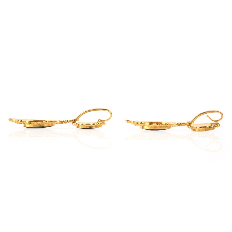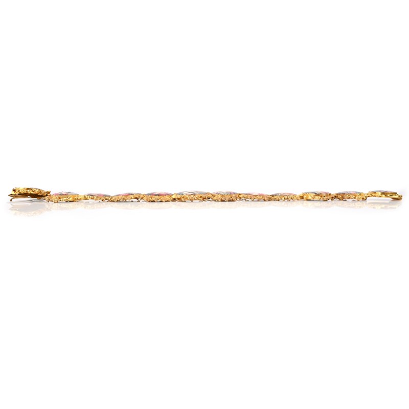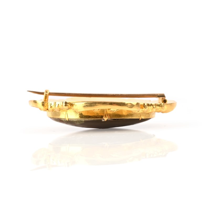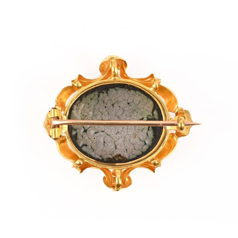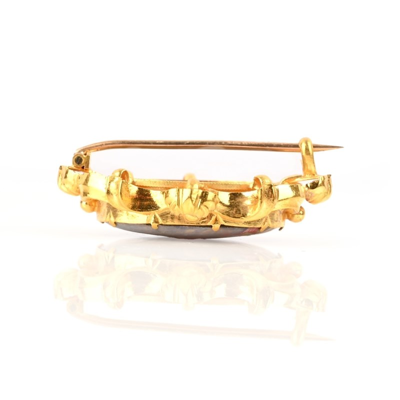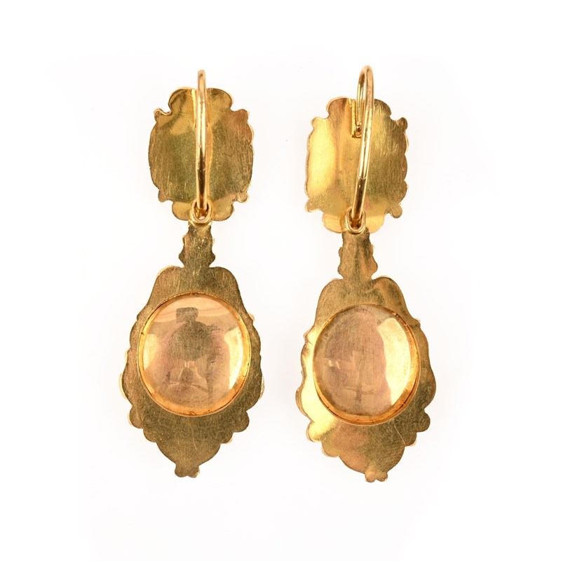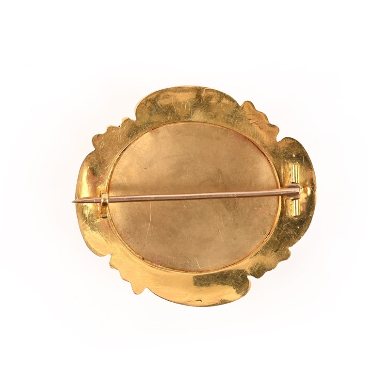A 19TH CENTURY PORTRAIT MINIATURE AND GOLD DEMI-PARURE, comprising: a choker necklace, each link set with an enamel portrait miniature of a lady in 18th century dress, one accented with rose-cut colourless paste, all within elaborate repoussé gold surrounds, length 32.5cm, gross weight 63g, one miniature chipped; a large clasp, set with four enamel miniatures of ladies set with rose-cut paste, in a similar gold surround, width 6.5cm, gross weight 27g; a brooch, set with an enamel miniature of a lady and her dog, within a gold surround, length 4.5cm, gross weight 13g; a smaller brooch, set with an enamel miniature of a lady, in a gold surround, length 3cm, gross weight 4g; a pair of pendant earrings, each set with two enamel miniatures of ladies, in gold surrounds, drops detachable, length 6.8cm, gross weight 18g; and four links, each set with a miniature of a lady, in gold surrounds, overall length 13.3cm, gross weight 37g