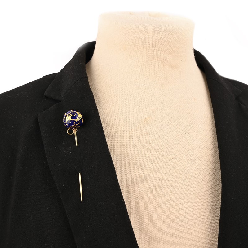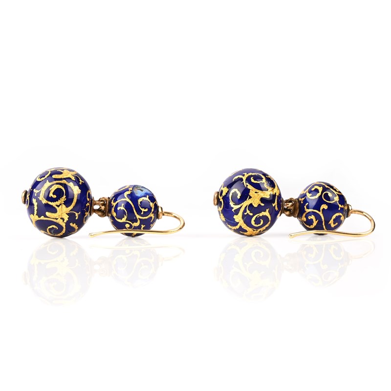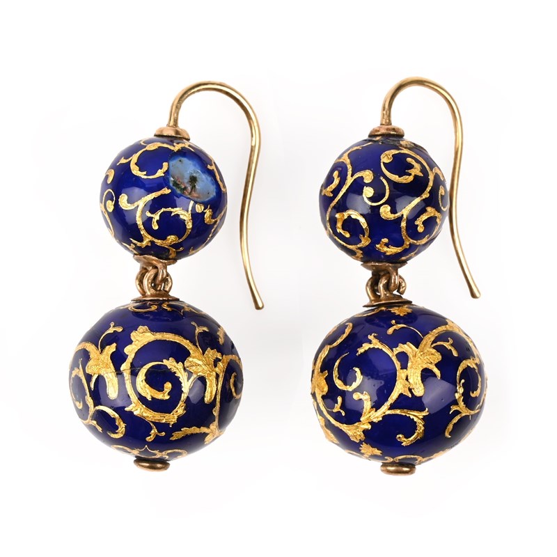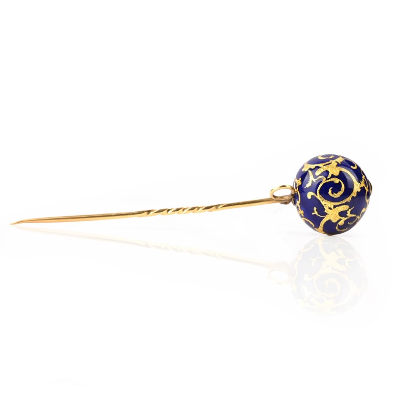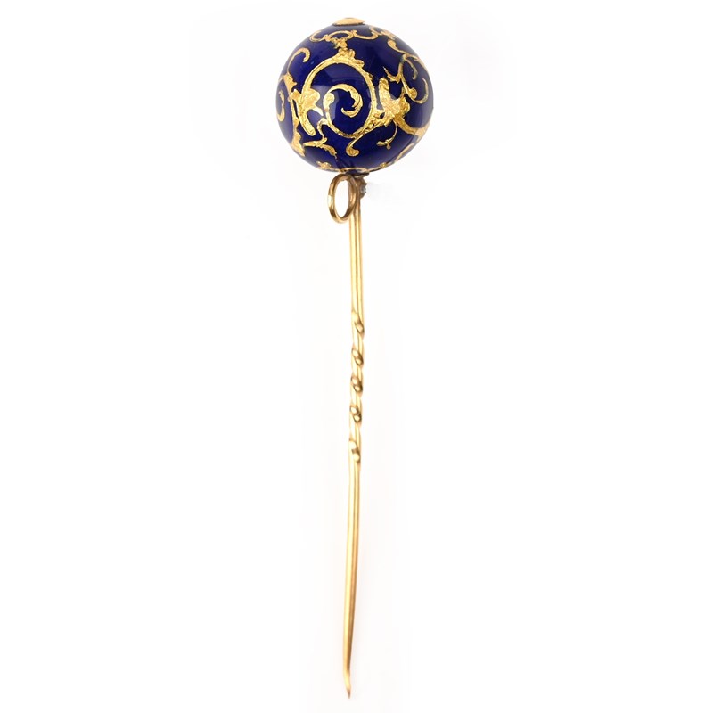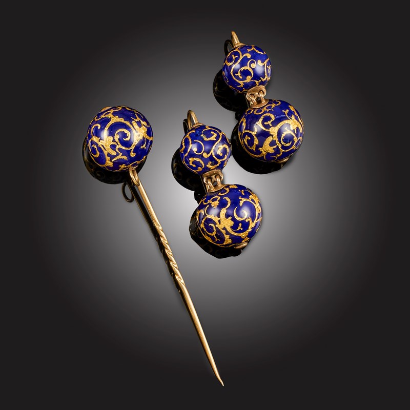 A PAIR OF VICTORIAN ENAMEL AND GOLD EARRINGS AND A STICKPIN, comprising: a pair of drop earrings, each composed of two graduated spheres decorated with chased scrolling against a blue enamel ground, in yellow gold, hook fittings, length 4cm, gross weight 15g, enamel chipped; and an enamel and gold stickpin en-suite, length 8cm, gross weight 6g, enamel chipped