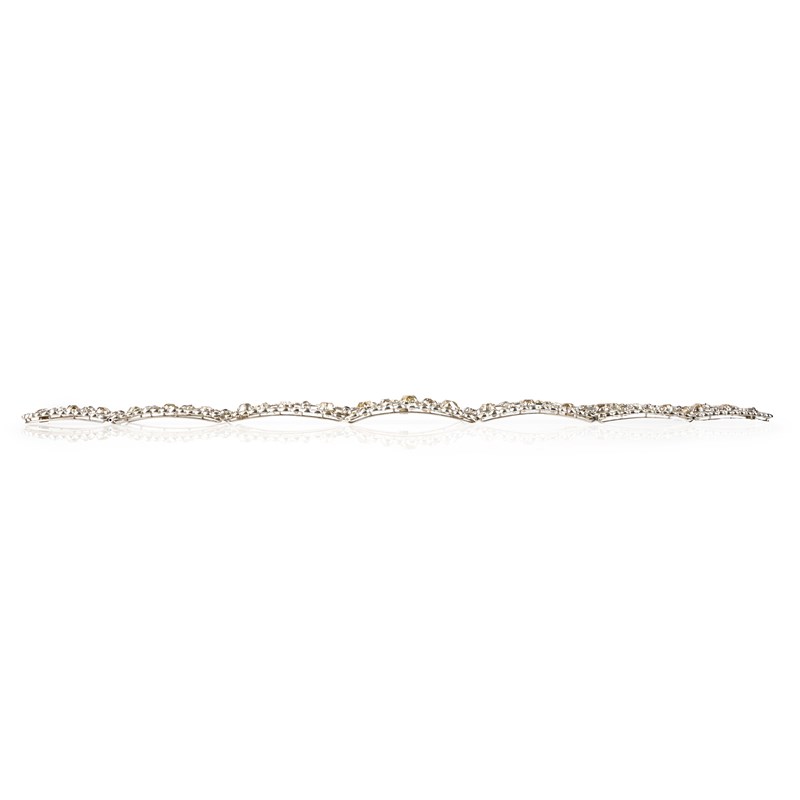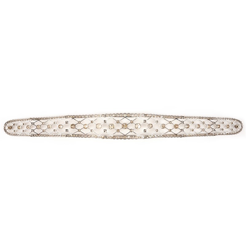 AN EARLY 20TH CENTURY DIAMOND BANDEAU, designed as an articulated tapering band decorated with an openwork trellis pattern set with graduated cushion-shaped diamonds, within a collet-set border of cushion-shaped diamonds, in platinum, length 23.5cm, lacking frame