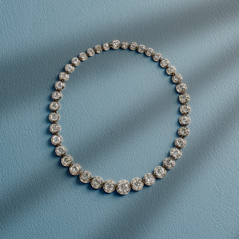A LATE 19TH CENTURY DIAMOND RIVIÈRE NECKLACE, the 40 graduated old cushion-shaped diamonds set in silver and gold cut-down collets, the nine principal diamonds all detach independently to reduce or extend the necklace, each engraved with a number to the collet so that they can be positioned in the necklace correctly, total approximate diamond weight 45.00 - 50.00cts, length 38cm