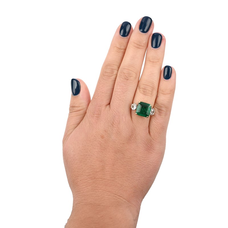 AN EMERALD AND DIAMOND RING, set with a square step-cut emerald to the centre weighing approximately 4.40cts, flanked by two old European-cut diamonds, in 18ct yellow gold, makers mark CLD, with London hallmarks for 1973, size L 1/2, case