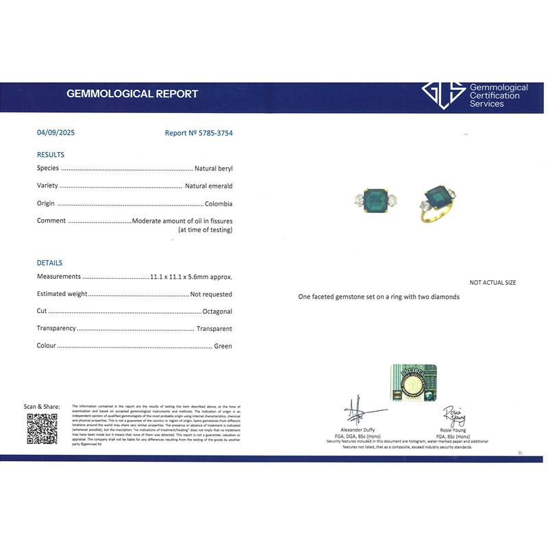 Accompanied by GCS report number 5785-3754 dated 4th September 2025 stating that the emerald shows moderate amounts of oil in the fissures, origin: Colombia