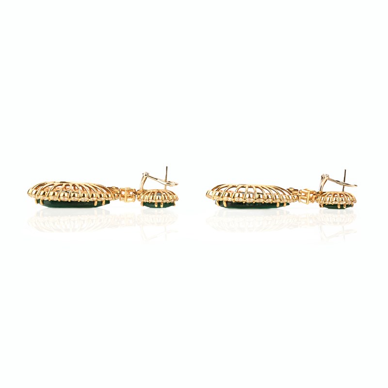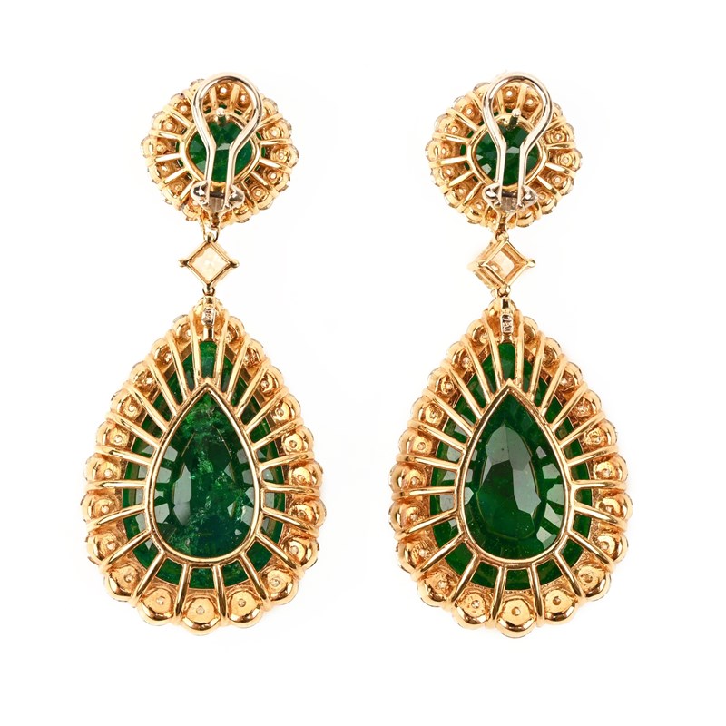 A PAIR OF EMERALD AND DIAMOND EARRINGS, each set with a cushion-shaped emerald within a surround of round brilliant-cut diamonds, suspending a yellow princess-cut diamond and a pendant centred with a pear-shaped emerald within a border of graduated round brilliant-cut diamonds, mounted in yellow gold, stamped 750, total approximate emerald weight 38.00cts, clip and post fittings, length 6cm