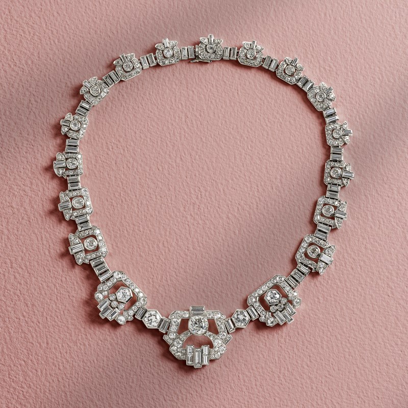 A strong geometric design and the prolific use of diamonds and platinum give the present lot its unmistakably Art Deco quality. Although all the big French houses produced recognisably Art Deco jewellery, Mauboussin epitomised this combination of features from 1929, when it introduced its 'Joaillerie blanche', or 'white jewellery'. This systematically featured the pairing of diamonds and platinum, often turning the compositional relationship between the two on its head. One of their innovations was the prominence afforded for the first time to the use of platinum, as the mounts came to the fore, becoming more than mere supports to the diamonds.