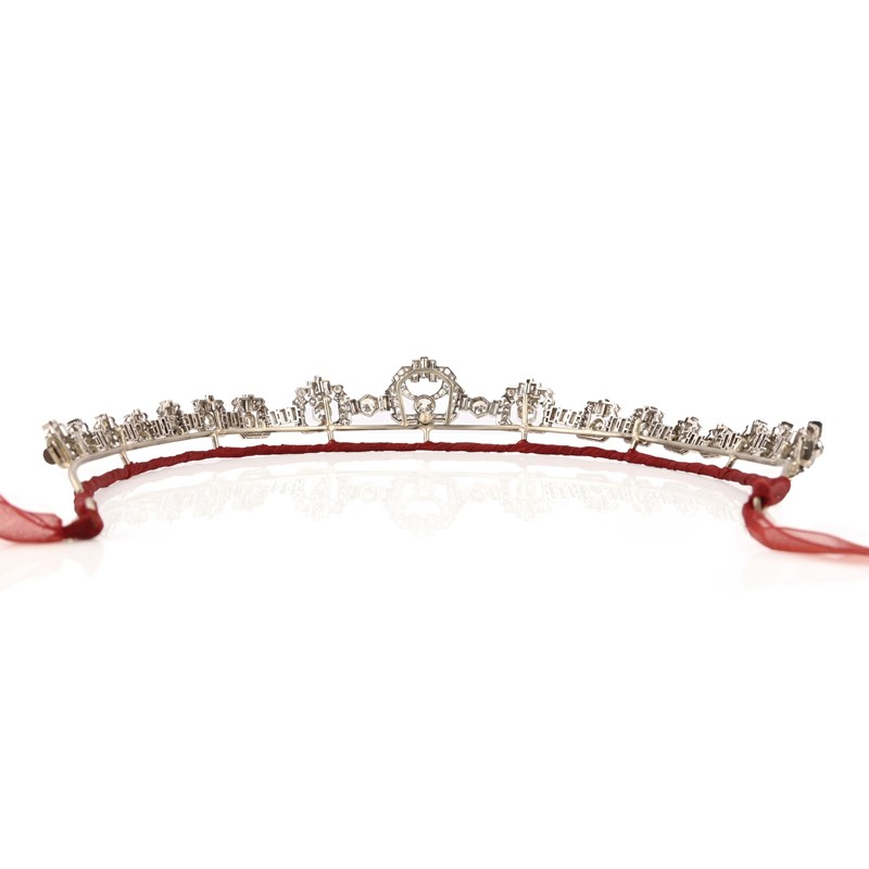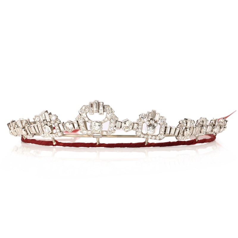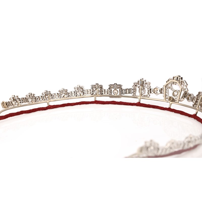A FRENCH ART DECO DIAMOND TIARA / NECKLACE, of graduating geometric design, set with circular-cut and baguette-cut diamonds weighing approximatley 25.00cts, mounted in platinum, detaching from the base metal frame to form a necklace, inner curve of tiara frame 42cm, tiara height to the centre 3.4cm, necklace length 35.5cm, stamped with a maker's lozenge, French control marks for platinum