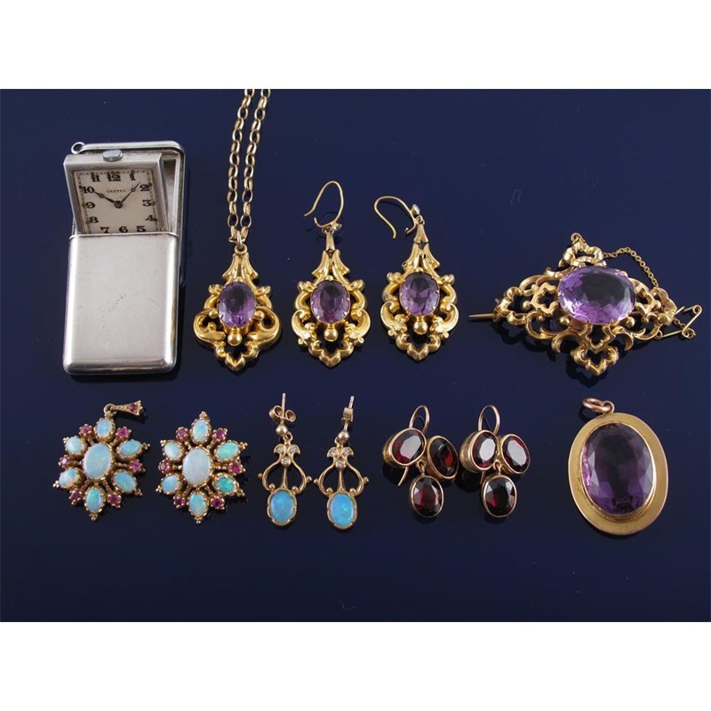 A gold brooch set with white opals and rubies. With a similar pendant. A pair of amethyst set gold drop earrings with a similar brooch and pendant on a gold chain. A pair of opal and diamond set gold earrings. An amethyst mounted gold pendant and a flip up silver travel watch by Vertex.