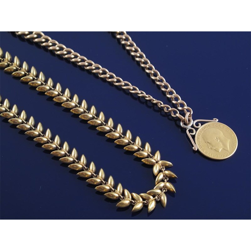 A 9ct gold graduated curb link watch chain with sovereign pendant. 47g. And a silver gilt leaf form necklace.