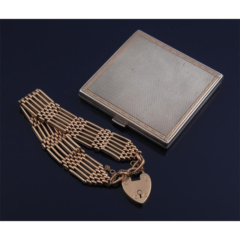 A 9ct gold gatelink bracelet. 17g. And a gold decorated engine turned square silver compact. 6cm wide.
