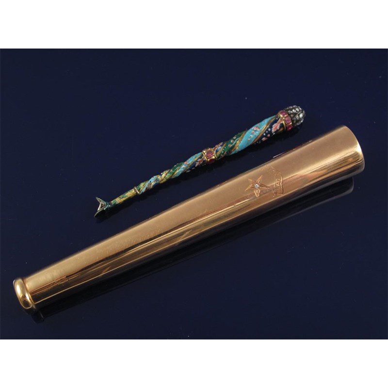 A gold tapered cylindrical handle with presentation inscription dated 1914 and a diamond set star. 58g. 14cm long. And a diamond set gold handle decorated with polychrome enamel and two bands of rubies (one missing). 9cm long.