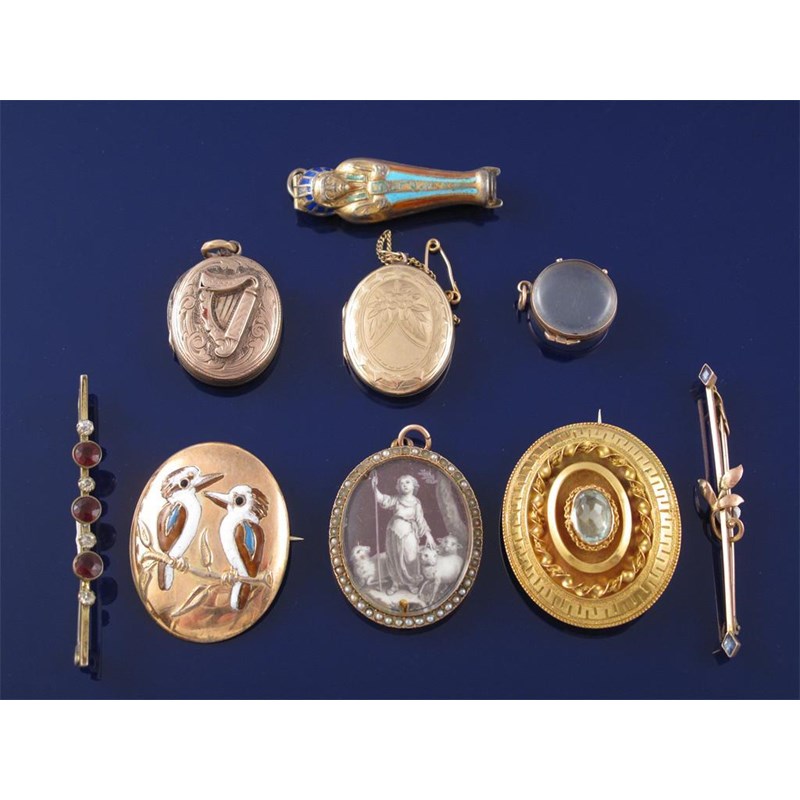An oval locket painted with a shepherdess within seed pearl border. A Victorian gold locket brooch centered with a blue stone. A mummy pendant and eight other pieces of jewellery etc.