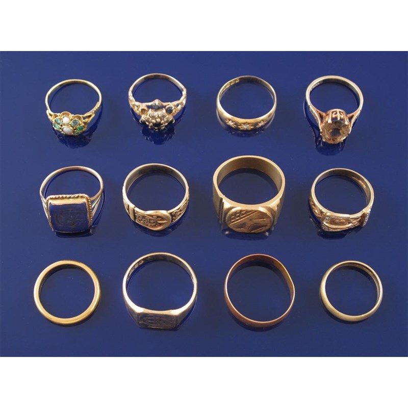 Eleven assorted gold rings and a large gold plated signet ring. 39g (not including the gold...