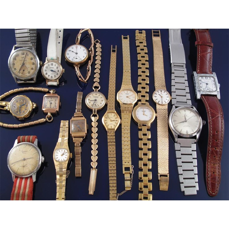 Four ladies assorted gold wristwatches with gold bands. And eleven other assorted wristwatches.