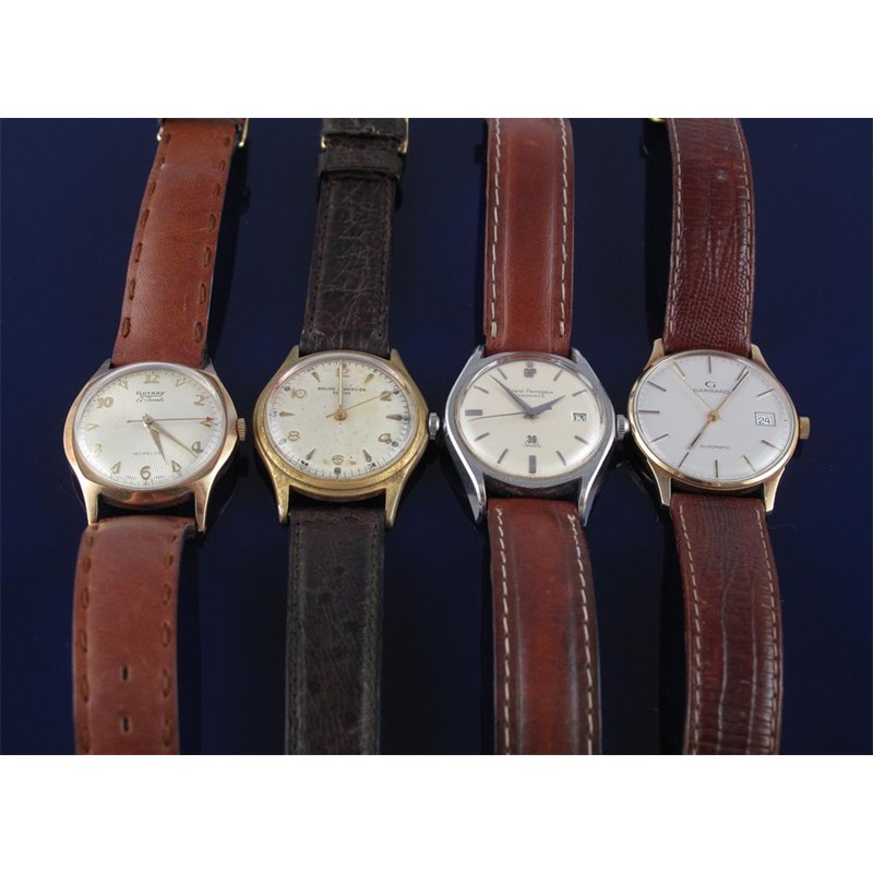 A 9ct gold wristwatch by Rotary sweep seconds hand and sunburst pattern to the dial. Manual movement associated leather band. And three other wristwatches by Baume & Mercier (manual), Girard-Perregaux (gyromatic with aperture date) and Garrard (automatic) (4).