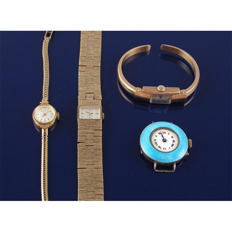 A ladies 18ct gold wristwatch by Altair. With hinged bangle. Case. A ladies 9ct integrated textured gold bracelet watch by Rotary. Damaged. And a ladies gold circular wristwatch with a gold V form flexible bracelet. And a ladies silver wristwatch with blue guilloche enamel bezel.