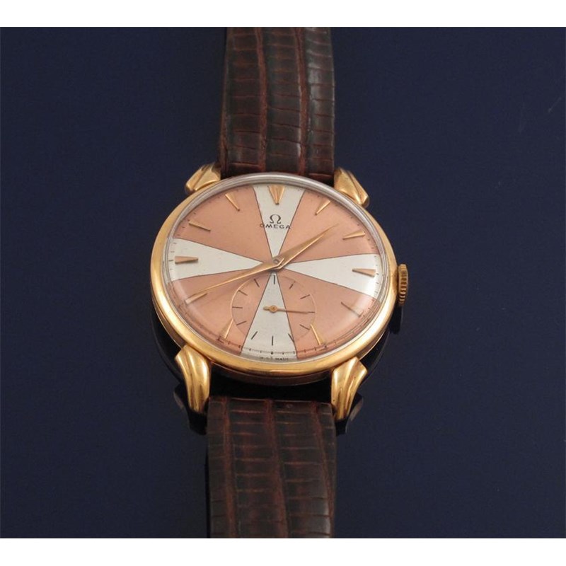 A gentleman's gold wristwatch by Omega. The large circular face quartered with pink sections....