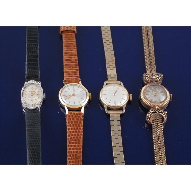 A lady's gold wristwatch by Bucherer on brown leather band. Two ladies gold wristwatches with...