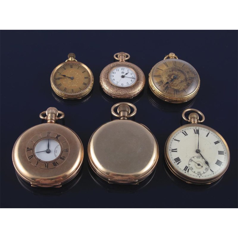 A 9ct gold half hunting cased pocket watch. Subsidiary seconds dial. A 9ct gold open faced pocket watch. A small open faced 18ct gold fob watch. An 18ct gold open faced pocket watch and two other pocket watches.