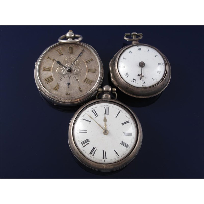 Two silver pear cased pocket watches. And a large silver open faced pocket watch.