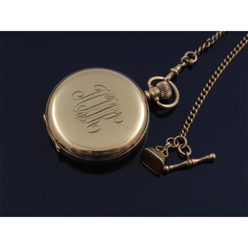 A 9ct gold hunting cased pocket watch. Subsidiary seconds dial. Cover engraved with initials. Reverse cover engraved with date. With a gold short watch chain with carnelian mounted fob seal with T-bar.