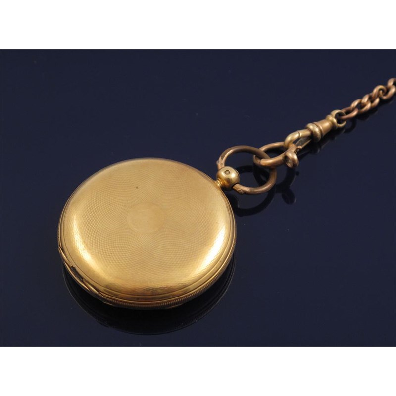An 18ct gold hunting cased pocket watch by James McCabe. Signed white enamel dial and numbered 138. Signed and numbered movement. With a 9ct gold curb link watch chain. The watch chain 30g.