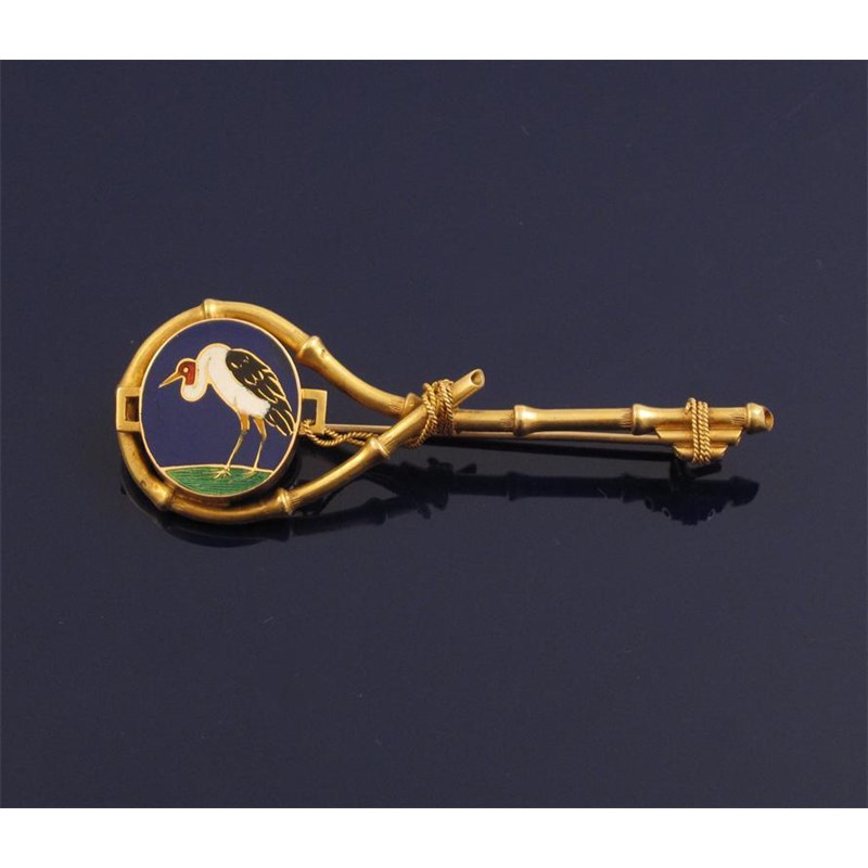 A gold bamboo brooch with enamel plaque depicting a crane. 6.5cm wide.