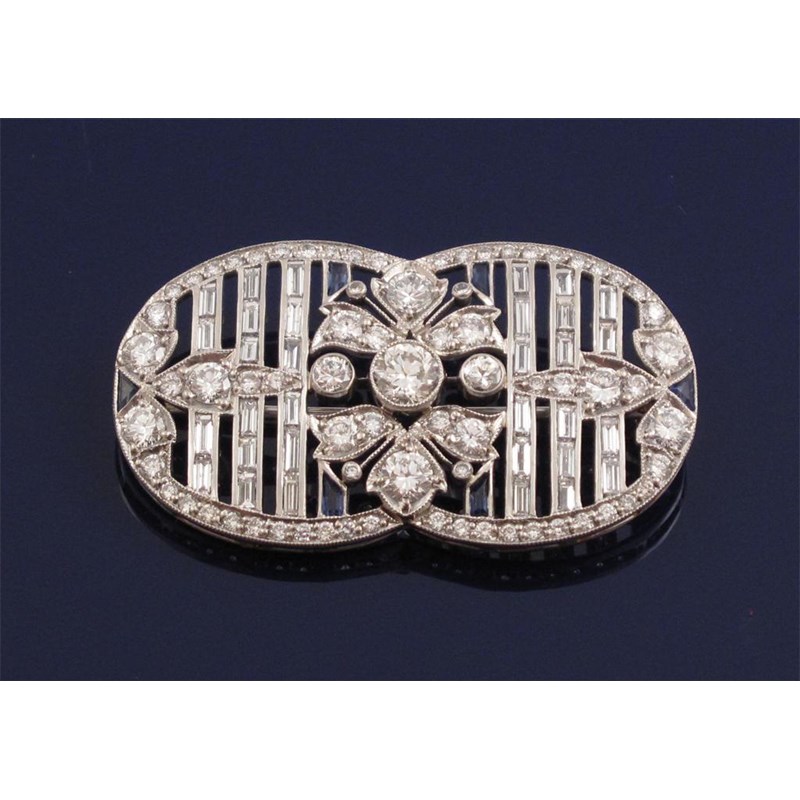 A diamond and sapphire brooch. The two ovals with foliate design, and set with graduated circular cut diamonds and lines of baguette shaped diamonds and six fancy shaped sapphires in gold.