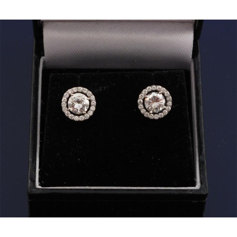 A pair of diamond cluster stud earrings. The brilliant cut diamonds are set within a surround of smaller circular cut diamonds in white gold. The diamonds weigh approximately 1.50 carats in total.