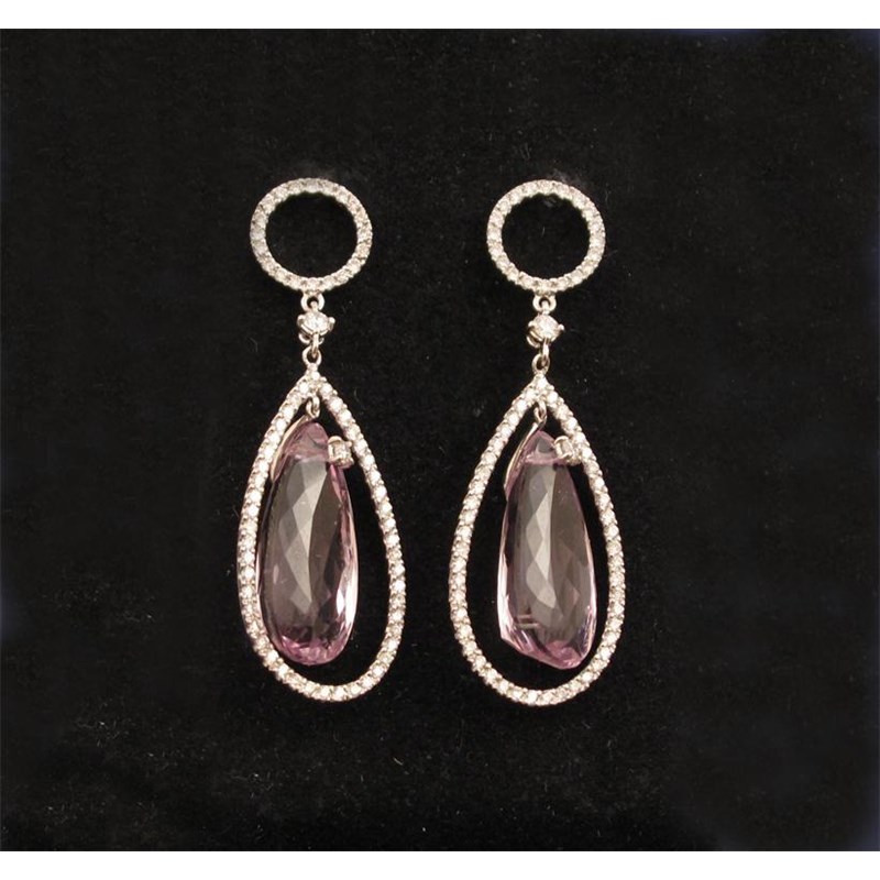 A pair of diamond and kunzite drop earrings. The pear shaped kunzites are set within a surround of circular cut diamonds in white gold.