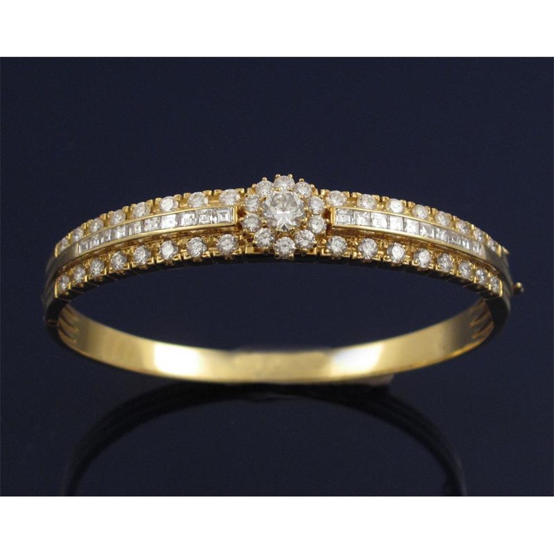 A diamond set yellow gold hinged bangle. Centered with a cluster of circular cut diamonds with further graduated square shape and circular diamonds to the shoulders. 31g. Similar to lot 1163.