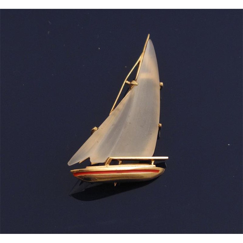 A gold yacht brooch. The sails formed as carved frosted rock crystal and a line of red enamel to the hull. 5cm high.