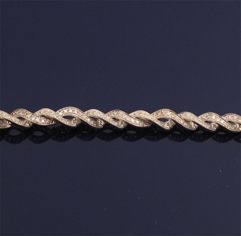 A white gold double twist bracelet set with circular diamonds. 18cm.