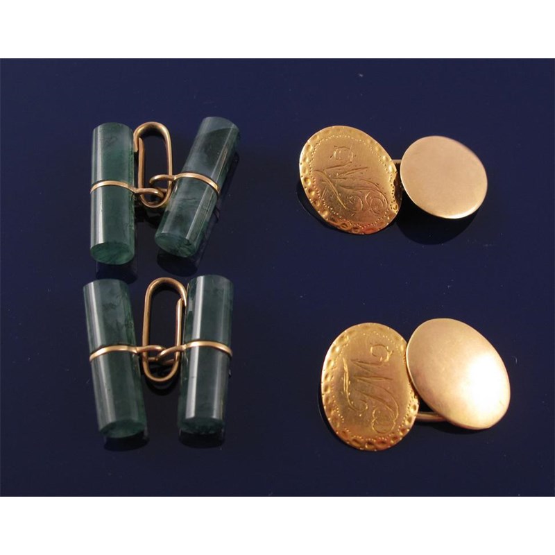 A pair of gold oval cuff links. Pricked with initials. And a pair of moss agate cylinder cuff links with gold mounts.