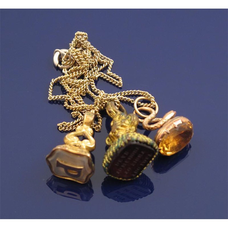 A citrine mounted snake fob seal with two other small fob seals and a fine link neck chain.