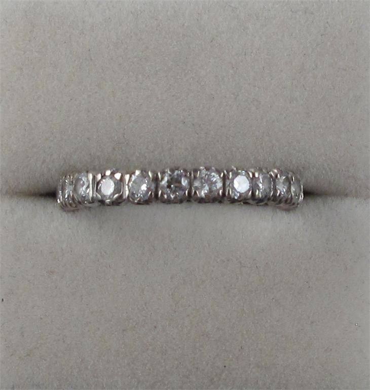 A diamond full circle eternity ring. The 23 circular cut diamonds are set in white gold. Size R.