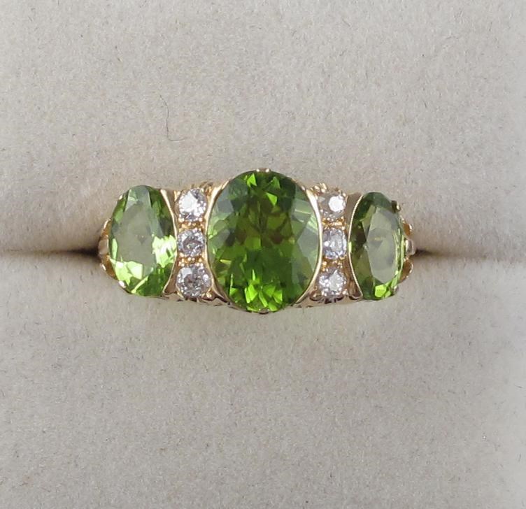 A three stone peridot half hoop ring. Set in gold with six small diamonds. Size M 1/2.