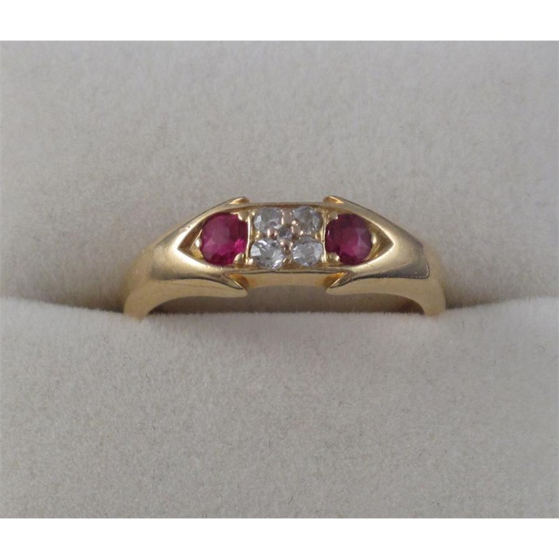 A gold ring set with two rubies and four diamonds. Size N. Box.