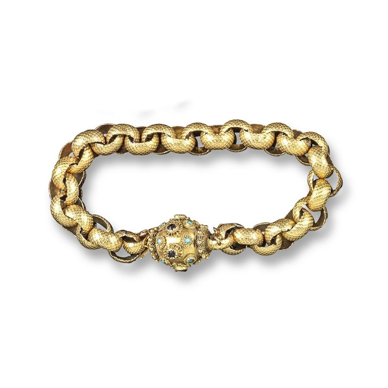 An early 19th century gold bracelet, the textured circular links with a cannetille gold clasp set with turquoise cabochons and amethysts. 21cm.