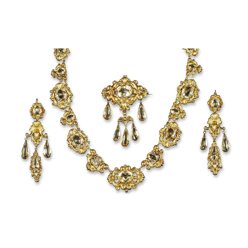 A cased suite of 19th century citrine-set gold jewellery comprising a necklace, a pair of earrings and pendant, all in scroll decorated pierced gold mounts. The necklace set with graduated oval-shaped citrines, repeated to the earrings and brooch which suspend further drop-shaped citrines. The necklace 42cm. The earrings 7.5cm high. Red leather fitted case.