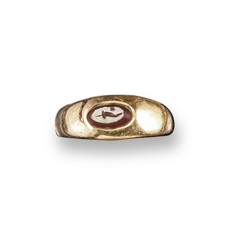 A Roman gold ring, mounted with a small oval-shaped engraved agate possibly depicting a torch. Oval-form.