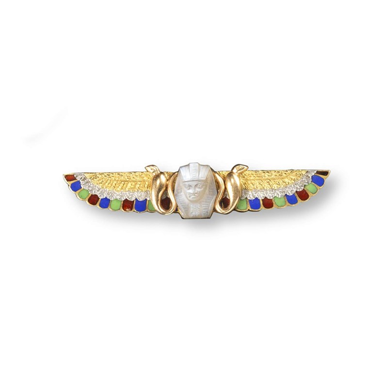 A carved moonstone Pharoah brooch, the realistically formed textured yellow and white gold wings, with a polychrome enamel pellet border. Mounted with two gold cobras. 5.4cm wide.
