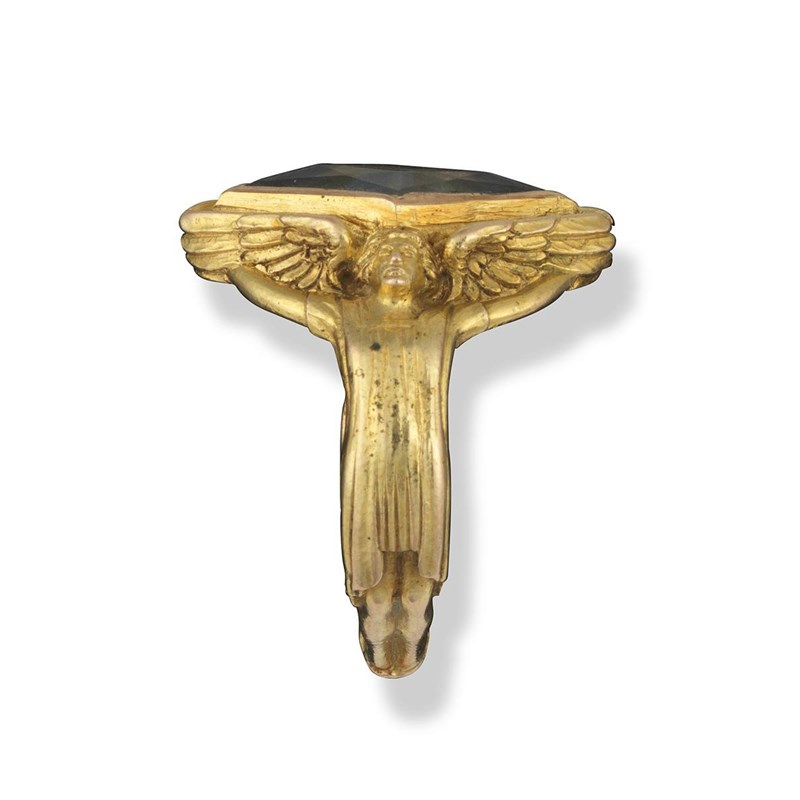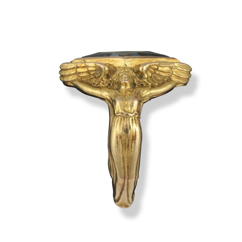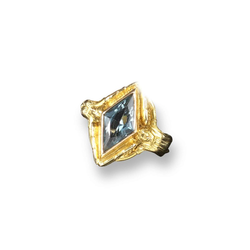 An Arts and Crafts Aquamarine and yellow gold ring, C1932. Centred with a lozenge-shaped aquamarine supported by a male and female angel with outstretched arms and wings with their legs forming the remainder of the shank. Engraved to the interior H.B to E.M.V.B., and signed OMAR RAMSDEN ME FECIT. Size L. With a badly water damaged box for Omar Ramsden.
