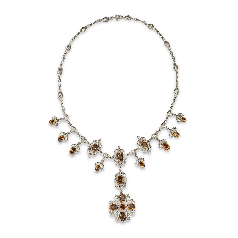 An Arts and Crafts necklace by Kate Eadie, set overall with graduated oval-shaped citrines to the foliate silver mounts on an ornate chain decorated with foliate links. The pendant and centre-section 8cm high the necklace 38cm long. Unsigned. Fitted case by Tadema Gallery.